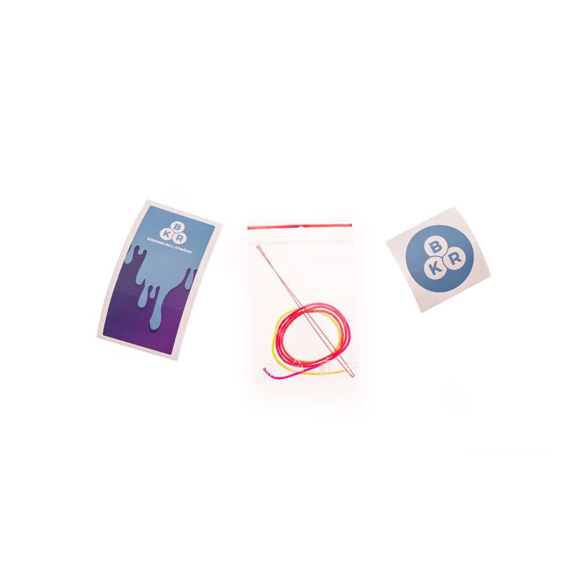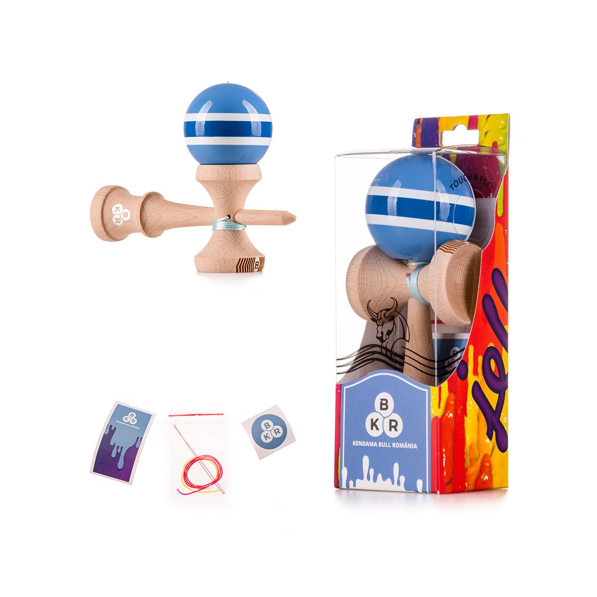 In cutie vei gasi kendama pe care ai ales-o, o ata premium de rezerva, un sticker u logo-ul „KBR” si inca unul cu designul personalizat.