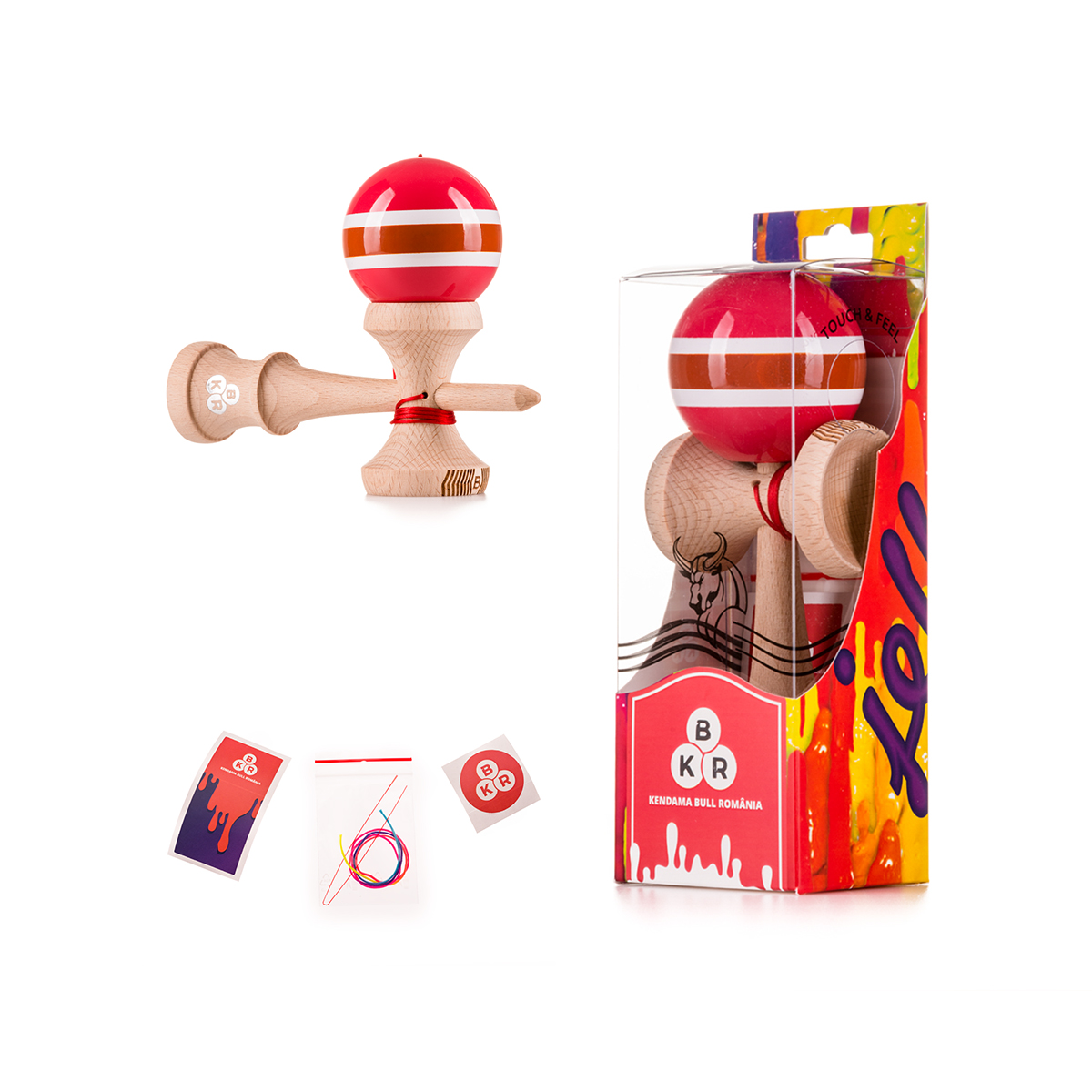 In cutie vei gasi kendama pe care ai ales-o, o ata premium de rezerva, un sticker u logo-ul „KBR” si inca unul cu designul personalizat.