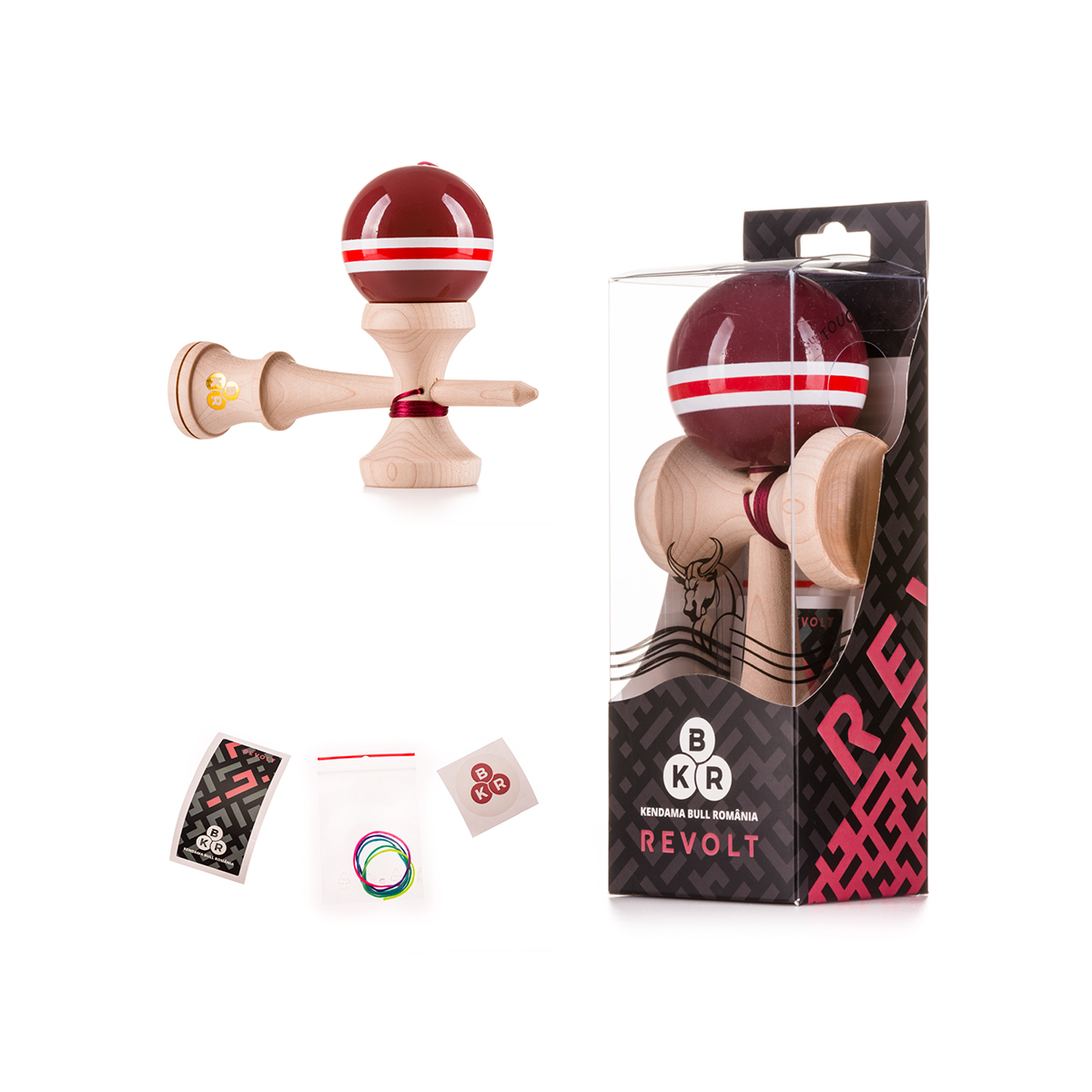In cutie vei gasi kendama pe care ai ales-o, o ata premium de rezerva, un sticker u logo-ul „KBR” si inca unul cu designul personalizat.
